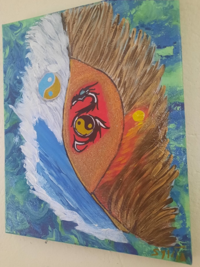 Au centre, un œil symbolique abrite un dragon, gardien de la sagesse et de la transformation. Ses couleurs intenses évoquent la lutte intérieure mais aussi l’harmonie qui naît de cette confrontation. L’énergie circule, invitant à reconnaître en soi la part d’ombre et de lumière, le mouvement et la sérénité.