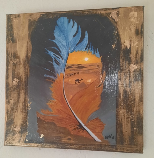 Dans cette toile intitulée De l’ombre à la lumière, une plume se déploie comme un passage symbolique entre deux mondes. Ses nuances de bleu et de feu dessinent une frontière délicate entre la nuit et le jour, l’ombre et la clarté, l’intériorité et l’espoir.
