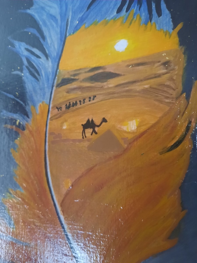Au cœur de la composition, le désert s’ouvre, baigné par la lumière du soleil. La silhouette d’un dromadaire, avançant doucement sur les dunes, incarne la force tranquille et la persévérance face à l’immensité.